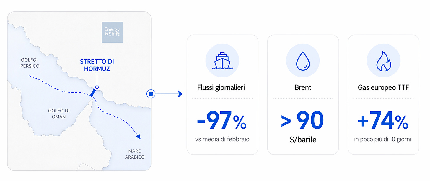 Lo stiamo vivendo in questi giorni. L’escalation militare tra Stati Uniti, Iran e Israele ha riportato al centro dello scenario lo Stretto di Hormuz, uno dei passaggi più delicati del sistema energetico globale, soprattutto per petrolio e GNL. Secondo l’UNCTAD, il principale organo sussidiario permanente dell’Organizzazione delle Nazioni Unite operante nei settori del commercio, sviluppo, finanza, tecnologia, imprenditoria e sviluppo sostenibile, il transito è diventato «praticamente chiuso», con i flussi giornalieri crollati del 97% rispetto alla media di febbraio. I prezzi hanno reagito rapidamente: il Brent è salito oltre i 90 dollari al barile e il TTF europeo ha registrato una forte volatilità. Non è necessariamente l’inizio di una crisi fisica dell’approvvigionamento, ma è il segnale di quanto i mercati prezzino subito il rischio di interruzione. Bruxelles ha valutato il rilascio coordinato di scorte di jet fuel; la Commissione ha avvertito gli Stati membri che uno shock prolungato potrebbe portare a tagli e tensioni sull’approvvigionamento.