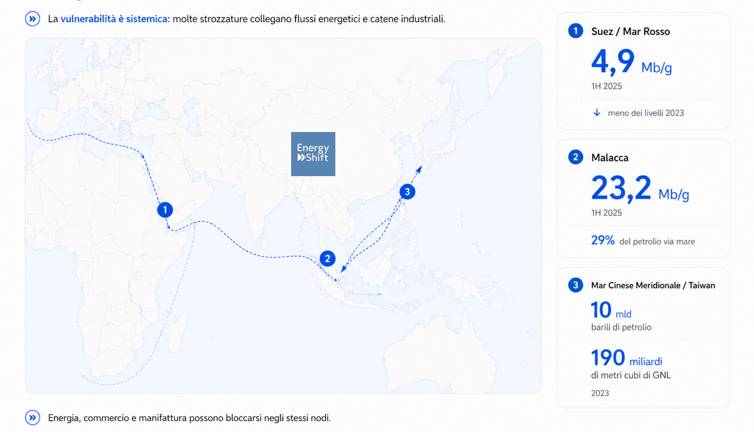 Poi c’è lo Stretto di Malacca, meno discusso in Europa ma decisivo per tutta l’Asia: nella prima metà del 2025 vi sono transitati circa 23,2 milioni di barili al giorno, pari al 29% dei flussi mondiali di petrolio via mare. Se lì si crea una crisi, l’impatto non riguarda solo Cina, Giappone o Corea del Sud: riguarda l’equilibrio dei prezzi a livello globale.