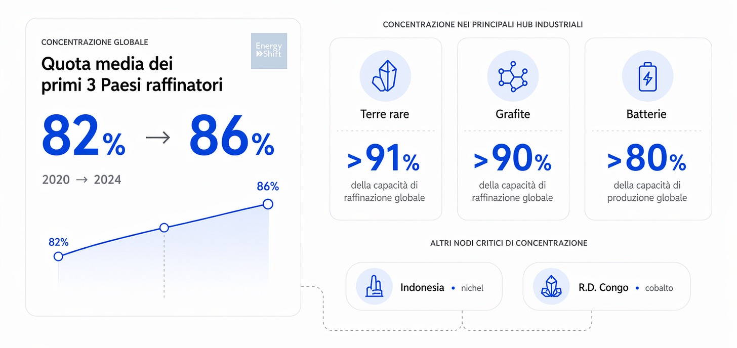 L’IEA segnala che tra il 2020 e il 2024 la quota media dei primi tre Paesi raffinatori dei minerali strategici è salita dall’82% all’86%. La filiera si sta concentrando, non distribuendo.