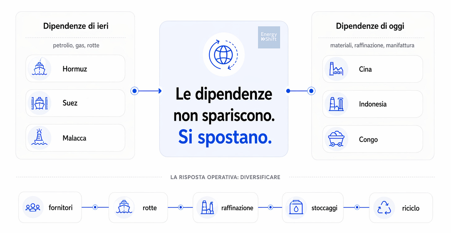 Parliamo spesso di indipendenza energetica come di un problema tecnico: più rinnovabili, più accumuli, meno fossili. È una parte della storia, ma questi giorni ci ricordano - ancora - che l'energia continua a dipendere da luoghi fisici molto precisi - stretti marittimi, corridoi logistici, miniere, raffinerie, poli produttivi - e quando uno di questi nodi si inceppa, le conseguenze possono propagarsi rapidamente sui prezzi, sulle rotte commerciali e sulle aspettative degli operatori, anche se il sistema fisico riesce talvolta ad assorbire parte dello shock.