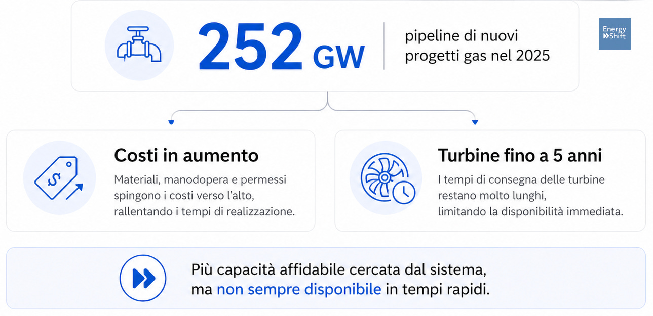 Il punto è che voler fare più gas non significa riuscire a farlo rapidamente. Sempre Reuters segnala che i costi dei nuovi impianti a ciclo combinato sono saliti molto e che i tempi di consegna delle turbine arrivano ormai fino a cinque anni. Quindi il gas è di nuovo “desiderato”, ma non è più una scorciatoia immediata. È una tecnologia che il sistema vorrebbe usare di più, ma che oggi incontra colli di bottiglia industriali simili, e in alcuni casi peggiori, di quelli che colpiscono le rinnovabili.