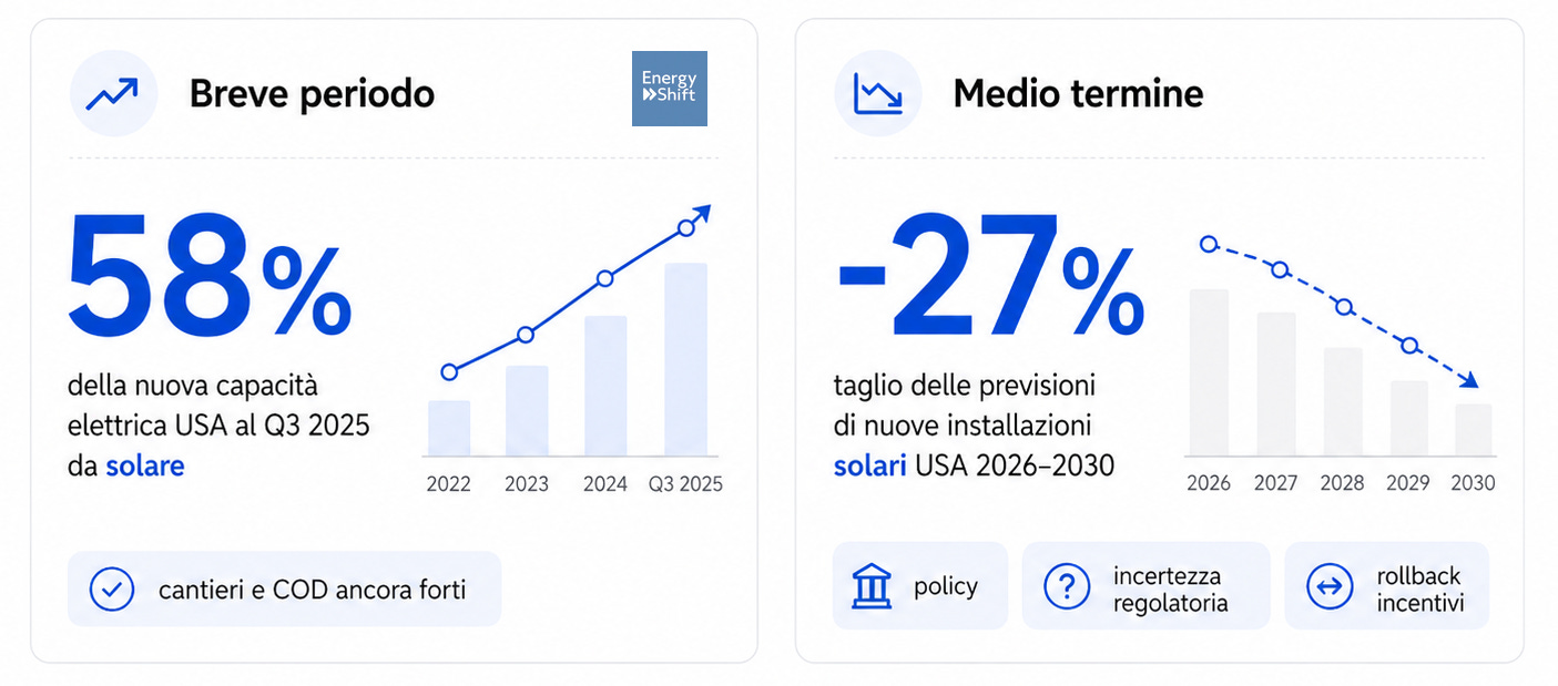 Ma se allarghiamo lo sguardo al medio termine, la risposta cambia. A settembre 2025 Reuters riportava che le previsioni di nuove installazioni solari USA per il periodo 2026-2030 erano state tagliate del 27% a causa di cambiamenti di policy, incertezza regolatoria e rollback di alcuni incentivi. In altre parole: nel breve le rinnovabili corrono ancora, nel medio rischiano di trovare più ostacoli politici e finanziari.