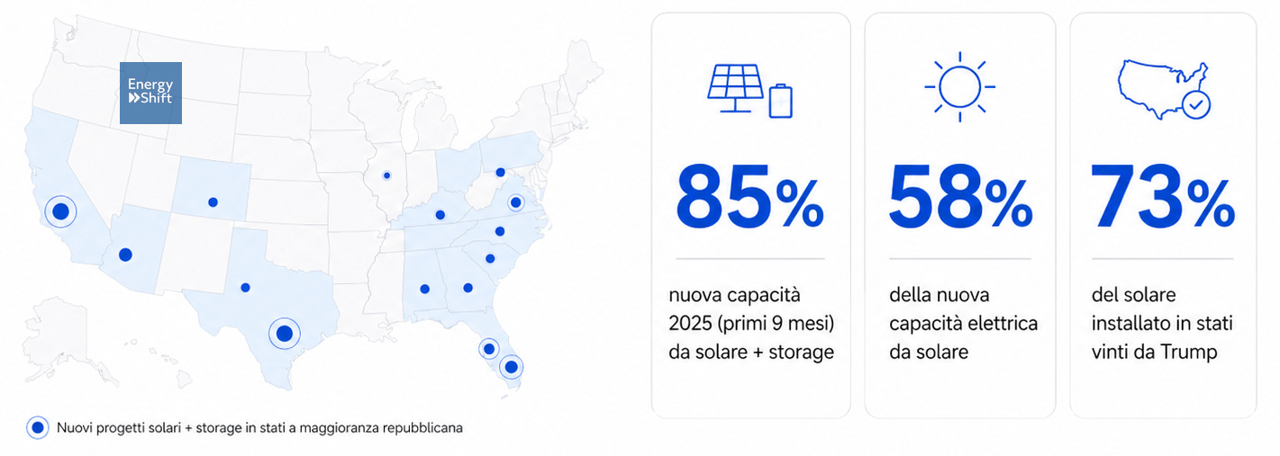 Ancora più sorprendente, il 73% del solare installato è arrivato da stati vinti da Trump, e 8 dei primi 10 stati per nuove installazioni appartengono a quell’area politica. È il segnale più chiaro che l’economia reale dell’energia si sta muovendo più velocemente delle sue narrazioni.
