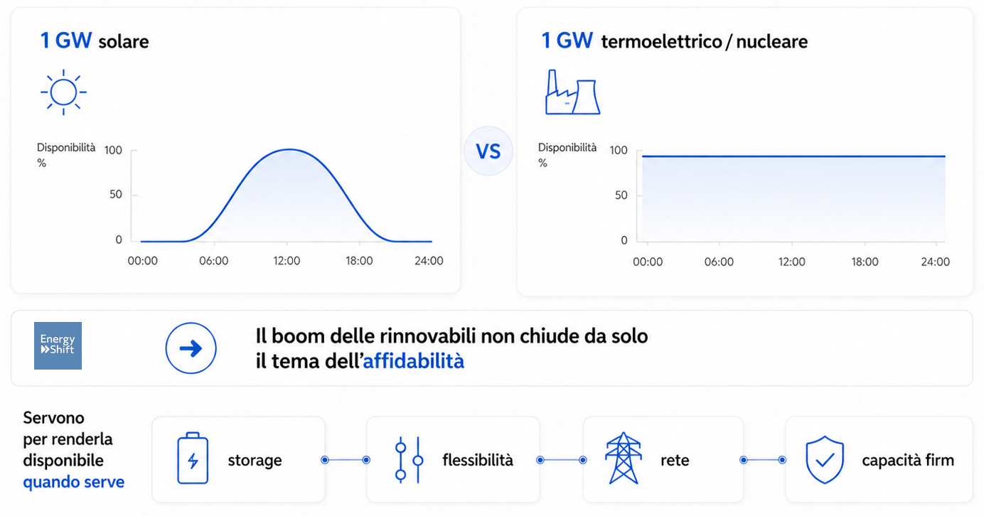 C’è poi un dettaglio decisivo che spesso viene nascosto dietro gli slogan: installare tanti gigawatt non equivale automaticamente ad avere tutta l’energia “utile” che serve, quando serve. Un gigawatt solare non vale, in termini di disponibilità continua, come un gigawatt termoelettrico o nucleare. Per questo il boom delle rinnovabili non chiude da solo il problema dell’affidabilità: lo sposta sulla combinazione con accumuli, flessibilità, rete e capacità firm.