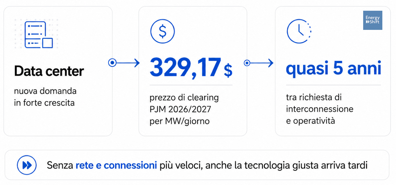 La questione più seria non è il colore politico dell’energia, ma la capacità del sistema di assorbire nuova domanda. Qui il caso simbolo è PJM, il più grande mercato elettrico americano. Nell’asta capacità 2026/2027 il prezzo di clearing è salito a 329,17 dollari per MW/giorno, dopo il precedente salto dell’anno prima. PJM e Reuters collegano questa tensione alla crescita della domanda, soprattutto dei data center, a fronte di un’offerta che non riesce a crescere con la stessa velocità.